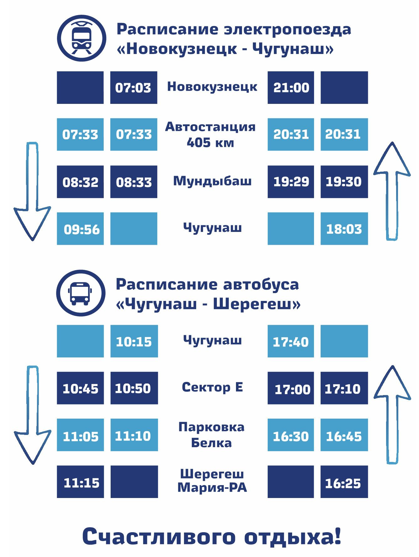 ВНИМАНИЕ: Льготы на проезд в электропоездах №6996/6995 по маршруту Новокузнецк – Чугунаш – Новокузнецк и автобусе на участке Чугунаш – Шерегеш не предусмотрены.